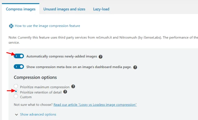 The WP-Optimize plugin will start optimizing your images using the external service reSmush.it or Nitrosmush. You can choose either service from the ‘Show advanced options’ drop-down. By default, reSmush.it will be the service selected.