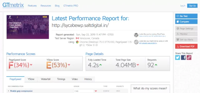 To measure the site’s speed before and after optimization on our test website, we will use the Google Pagespeed Insights and GTMetrix speed measuring websites. When our test website is run on these services before using the WP-Optimize plugin, we get the following scores.